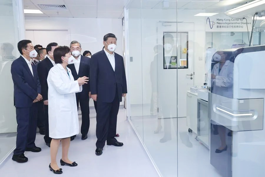 ▲2022年6月30日下午,習近平在香港特別行政區行政長官林鄭月娥陪同下,來到香港科學園考察。這是習近平在香港神經退行性疾病中心考察。