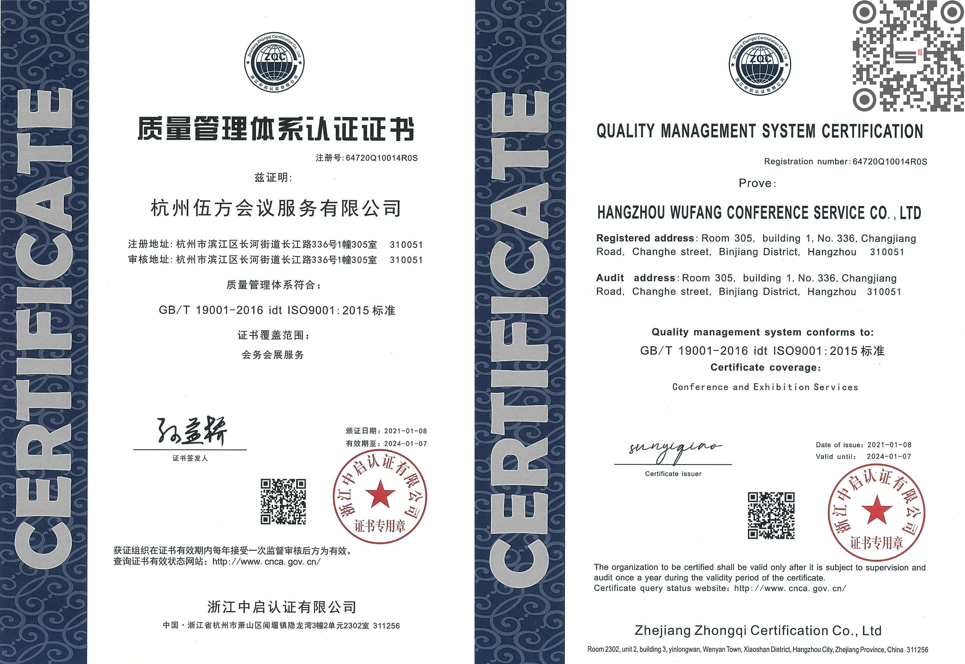 杭州伍方會議服務有限公司質量管理體系符合:GB/T 19001-2016 idt ISO9001:2015標準,認證范圍:會務會展服務,證書編號:64720Q10014R0S,會展服務質量管理體系認證證書有效期限:2021-01-08至2024-01-07。