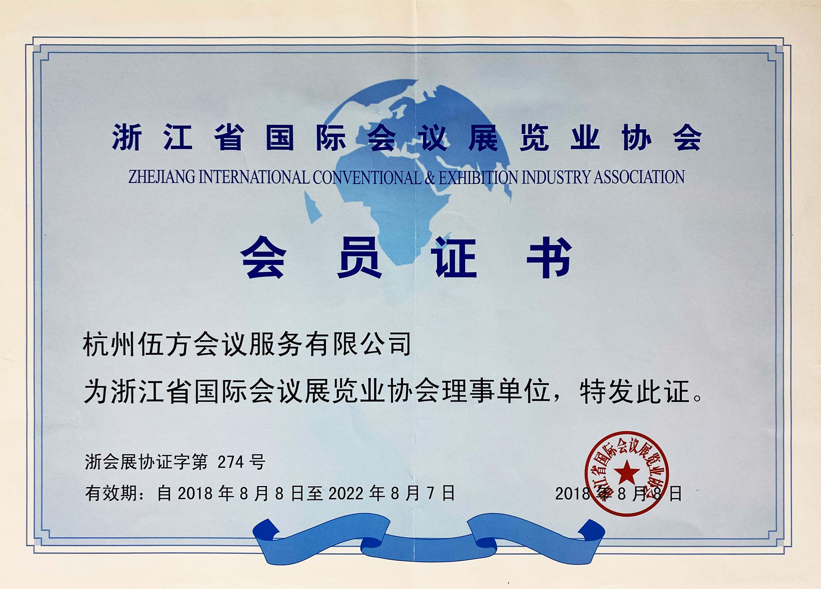 杭州伍方會議服務有限公司為浙江省國際會議展覽業協會理事單位,有效期自2018年8月8日至2022年8月7日。