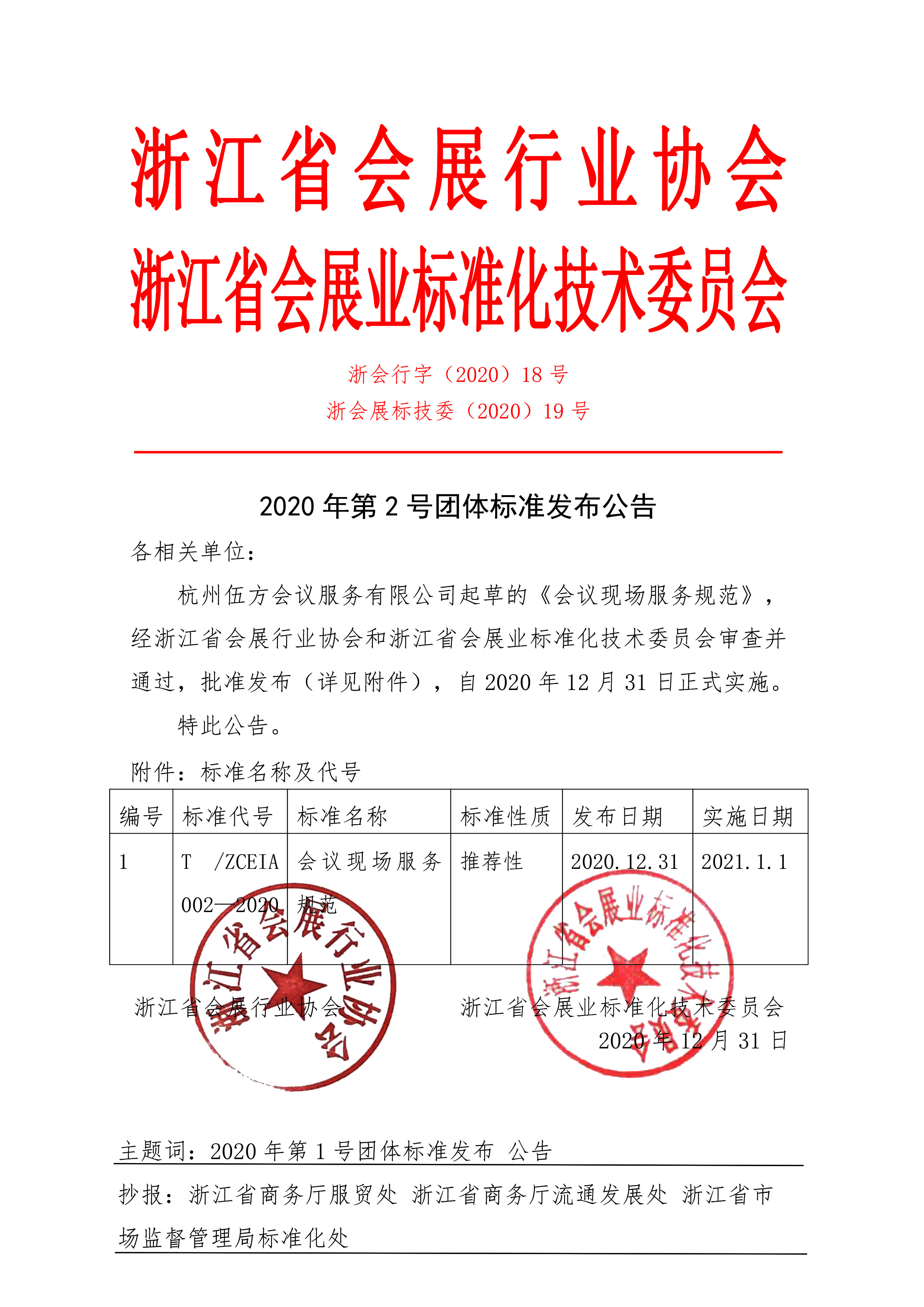 杭州伍方會議服務有限公司起草的《會議現場服務規范》,經浙江省會展行業協會和浙江省會展業標準化技術委員會審查并通過,批準發布,自2021年1月1日正式實施。