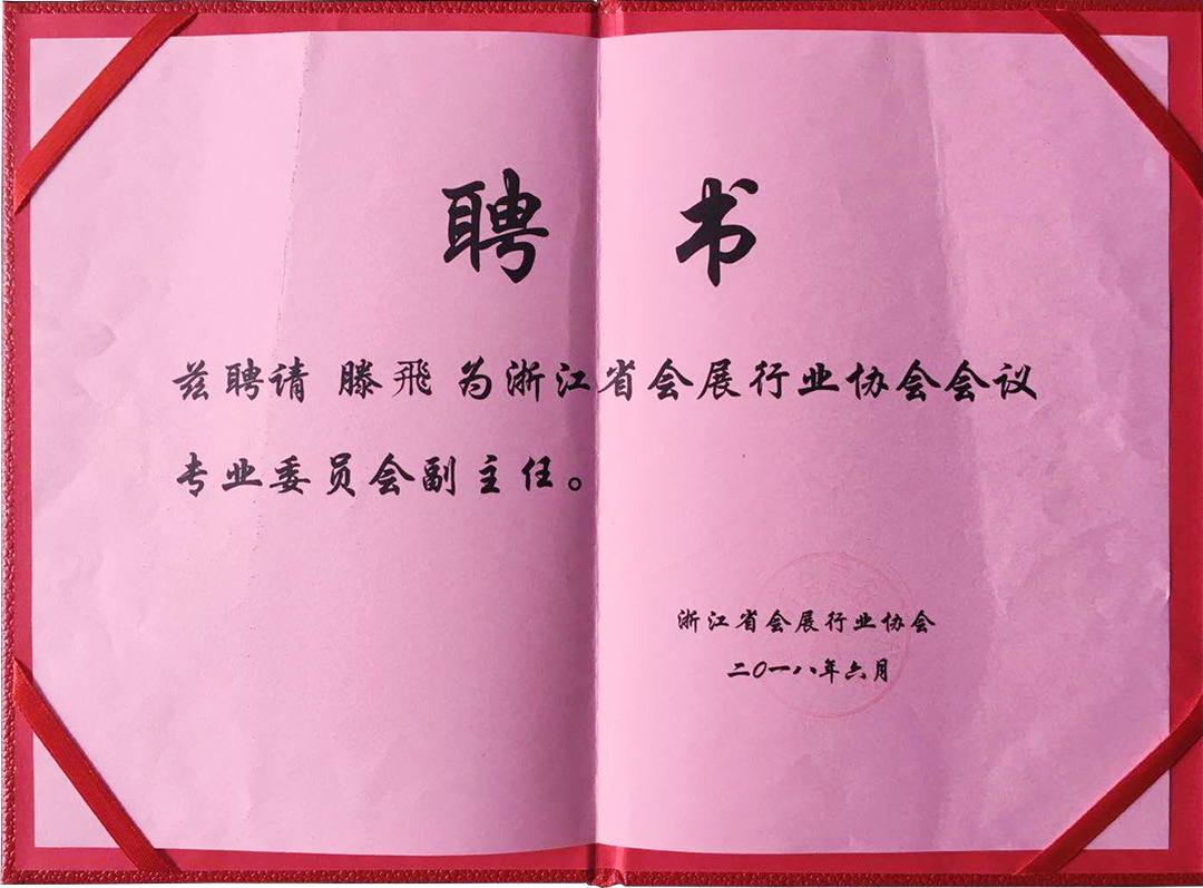 茲聘請杭州伍方會議服務有限公司董事長滕慶磊為浙江省會展行業協會會議專業委員會副主任。