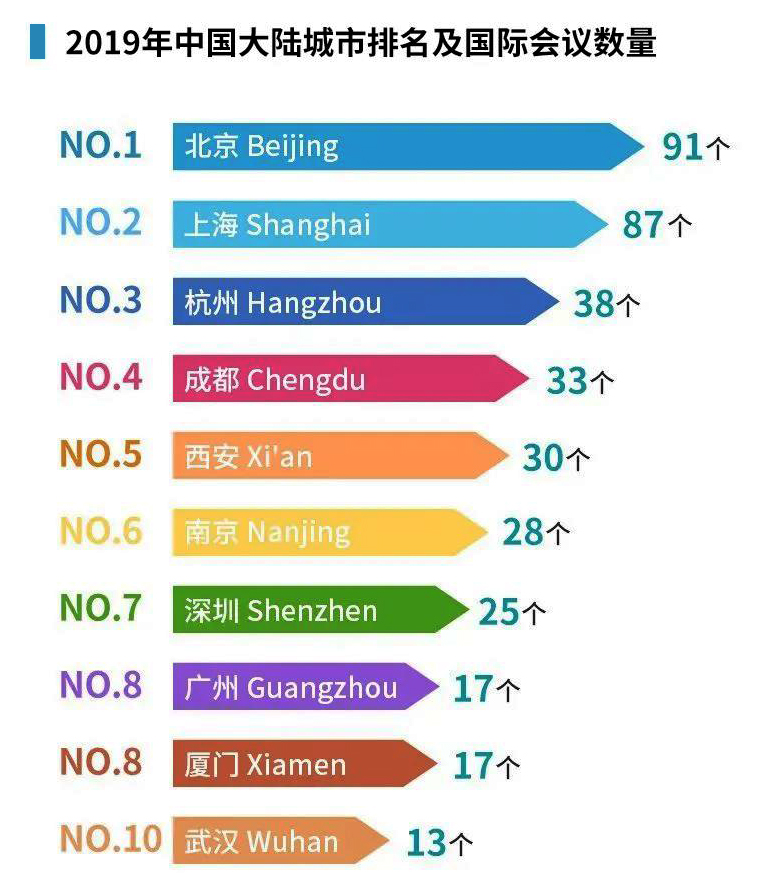 5月12日,國際大會與會議協會(ICCA)發布了2019年度全球會議目的地城市國際會議數量排行榜。2019年杭州共舉辦了38個符合ICCA標準的國際會議,在全球5214個城市排名中位居第74位,在亞太870個城市排名中位居第17位,在中國大陸城市排名一直保持第3位。